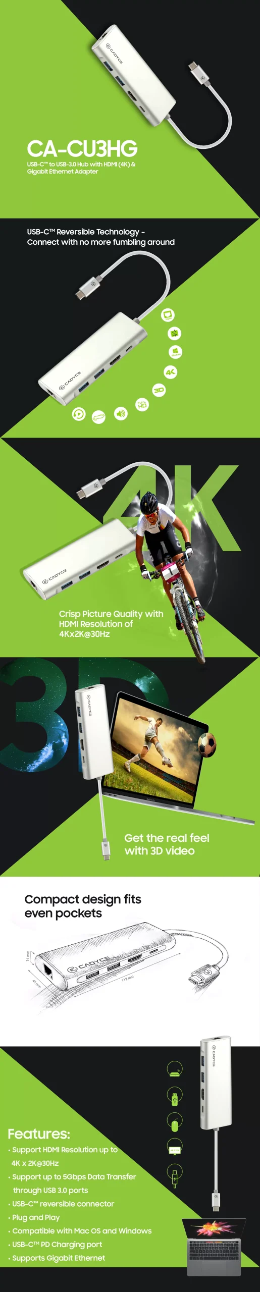 ThunderboltTM 3 port compatible CA-CU3HG, provides extraconnectivity ports such as Gigabit Ethernet, HDMI, USB 3.0 andUSB-CTM PD charging port to your USB-CTM enabled computer.