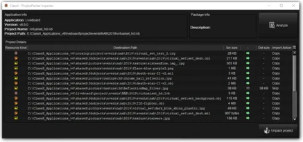 The ProjectPacker interface when analyzing the project to import.