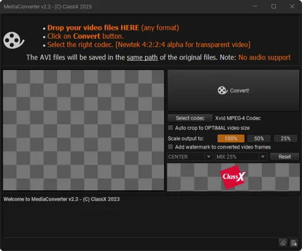 Transform any video supported by FFMPEG in broadcast quality (with frame-accurate), supporting alpha channel! Simply drag-and-drop your file onto the MediaConverter user interface and click "Convert". Batch conversion supported.