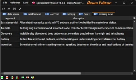 The graphic user interface of NewsEditor is very simple and immediate. Each file or data source is displayed in a tab. Each tab shows the name of the file in its label and its contents displayed in a table.