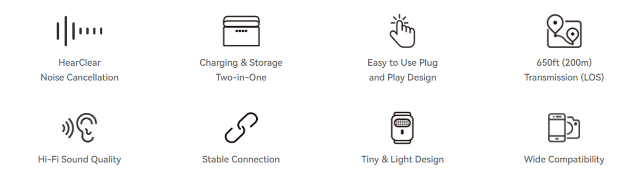 5. Simply unbox the package, remove the insulating film, and place it back in the charging case, TX and RX will automatically pair, and you can begin recording without any delays.