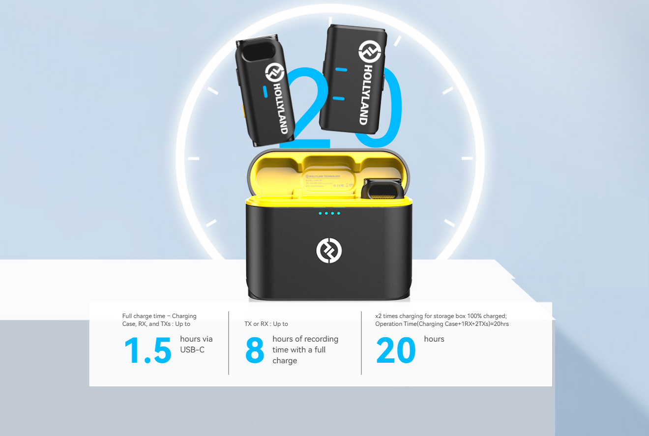The M1 is truly compact weighing in at only 0.4 oz (11.8g) and a mere 0.4" (1cm) in thickness.This compact mic is light enough to snap on virtually anyone's collar. The charging case is designed for both charging & storing of two transmitters and the receiver for optimum use duration and portability.