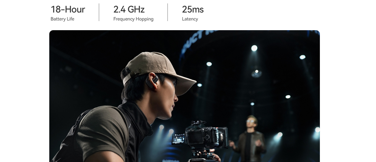 2.4 GHz frequency hopping anti-interference tech guarantees stable and crystal-clear audio with rich dynamics even in crowded environments. With ultra-low 25ms latency (TX to OWS earphone) and 18-hour battery life, it's built for performance. The OWS earphone doubles as a Bluetooth earphone, seamlessly blending work and downtime.