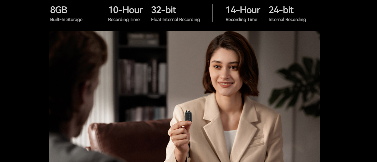 Each transmitter features 8GB of built-in storage, capable of recording up to 14 hours of uncompressed high-quality audio. This serves as a secure backup, ensuring no precious audio is ever lost. Additionally, the transmitter can function as a standalone voice recorder, capturing audio directly to the device independently of your camera or smartphone, providing dual assurance for on-site recording.