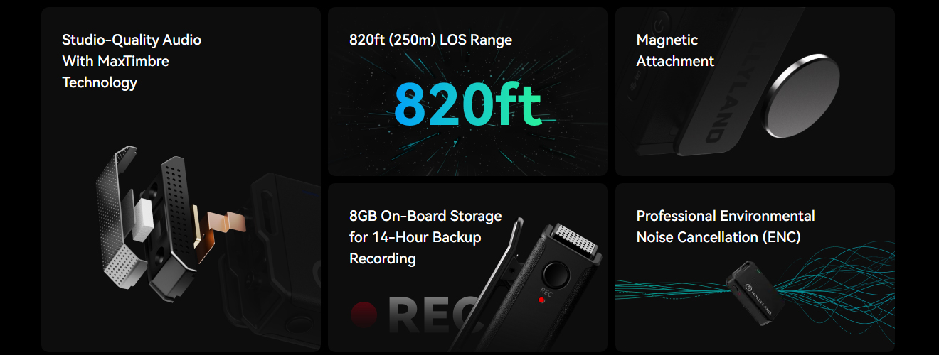 The LARK MAX is an all-in-one wireless lavalier microphone system with industry-first MaxTimbre Mic technology and advanced ENC technology providing an unparalleled crystal-clear sound. The transmitter has 8GB of built-in memory, providing up to 14 hours of backup recording. It is perfect for interviewing, vlogging, podcasting, electronic field production, online teaching, and any audio recording applications requiring high-quality audio pickup and a peace-of-mind audio backup solution.
