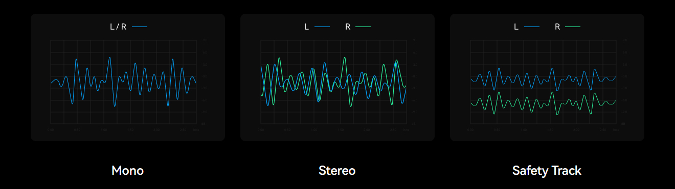 Select the most suitable audio recording mode: mono, stereo, or safety track for recording security and more flexibility in post-production.