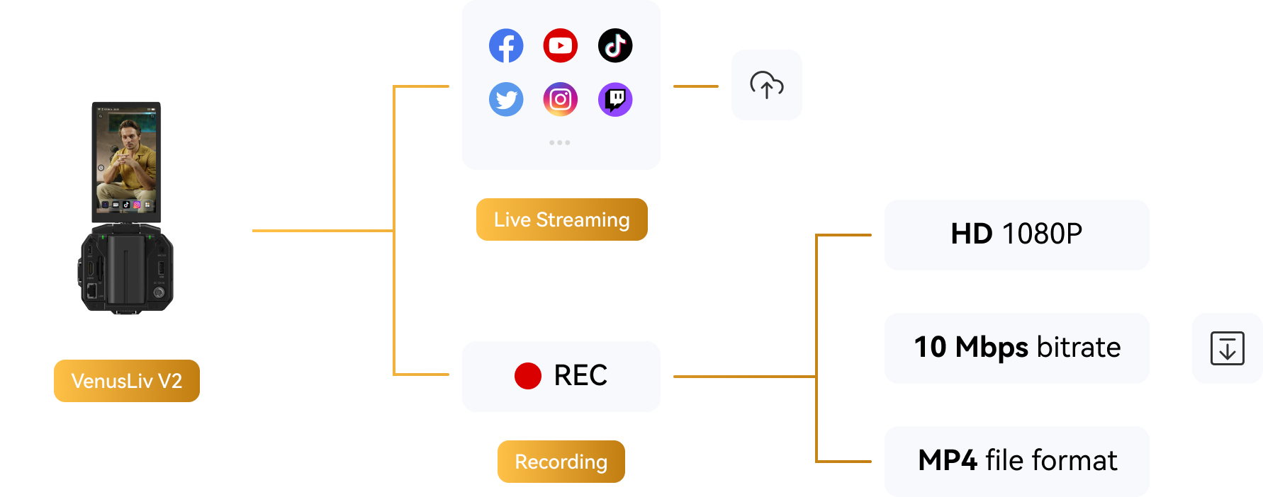 The VenusLiv V2 offers a smooth and uninterrupted streaming experience because of its advanced aerospace-grade heat dissipation system. This system ensures optimal performance without the risk of issues caused by overheating, such as frame stuttering or unexpected shutdowns. With the flexibility of using an external NP-F battery or DC power supply, you can stream continuously both indoors and outdoors.