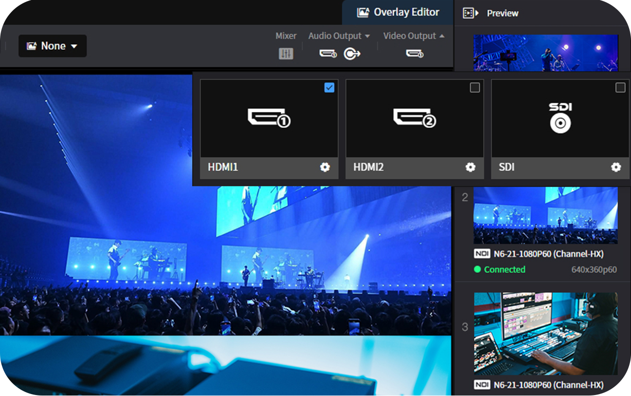 D260 supports “preview + output” mode, in which you can preview 16 video streams and select 4 of them to display on the screen for output simultaneously. This feature can also be used for monitoring (PVW/PGM).
