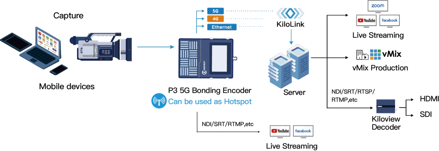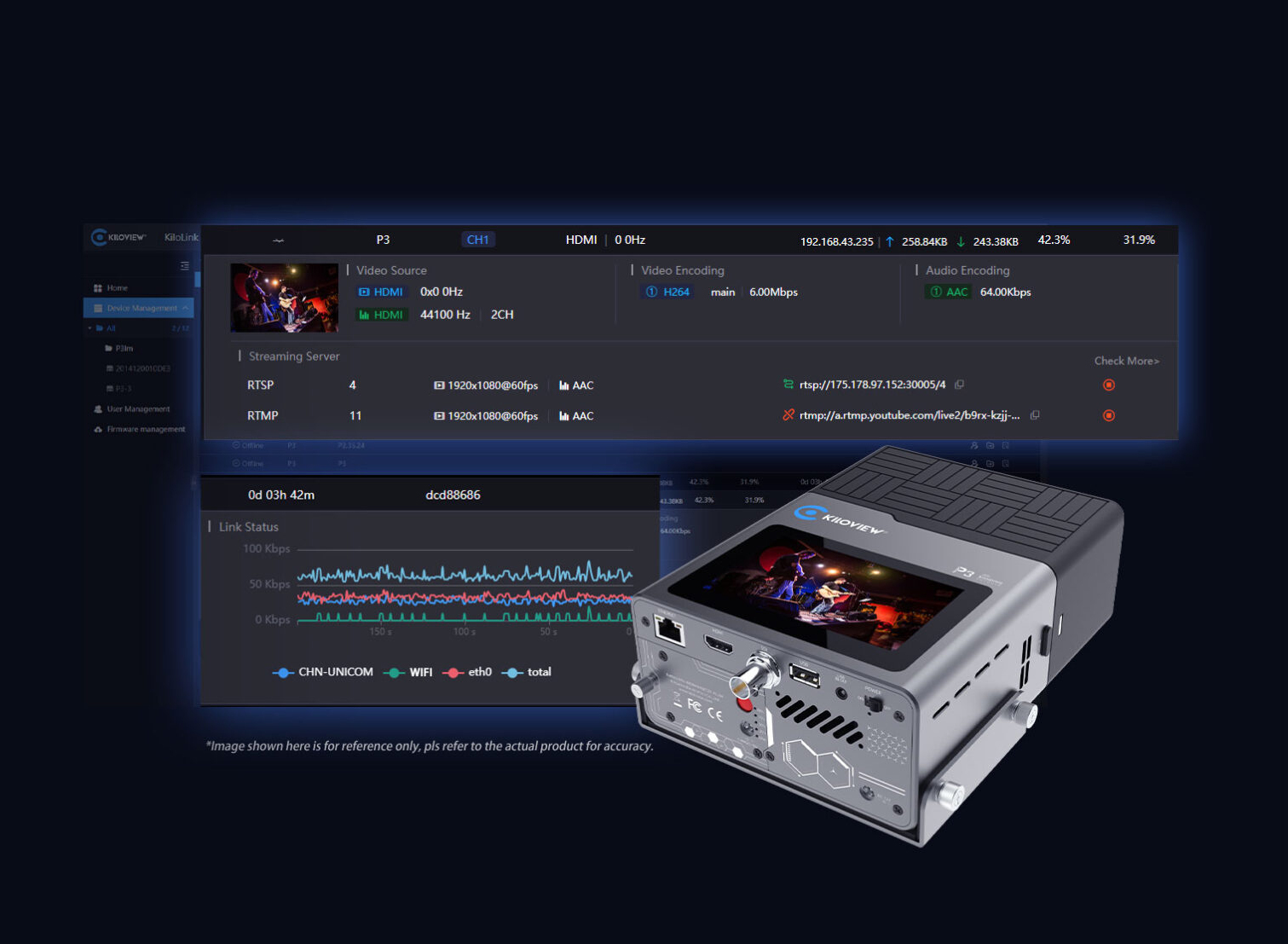 The P3 features 3G-SDI and 4K HDMI video inputs with H.265/H.264 encoding, compatible with multiple streaming protocols such as RTSP, RTMP, SRT, HLS and NDI HX. It can stream directly to external platforms without the need for a relaying server, or provide an unlimited bonding and seamless streaming experience with the permanently free or privately hostable KiloLink Server Pro.