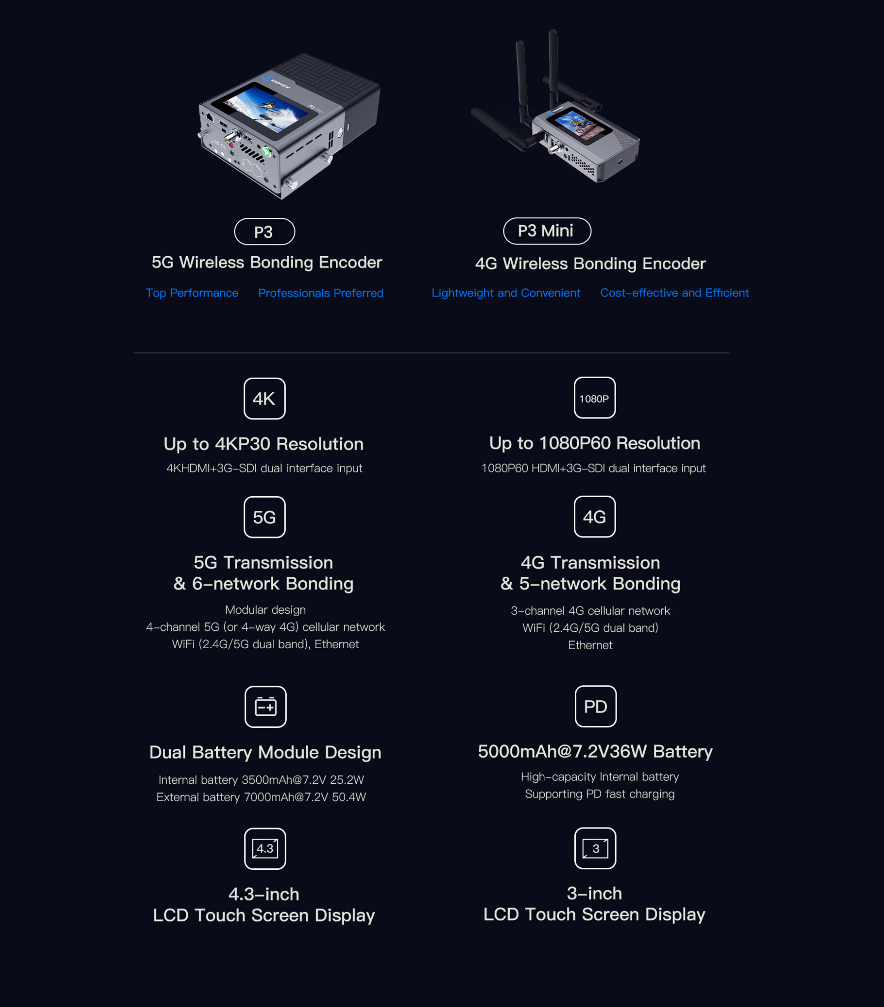To meet the diverse needs of business situation (such as small-scale studios/ large-scale event live streaming), P3 adopts a more flexible modular design. You can choose the most cost-effective solution by picking 5G/4G and battery modules. The device is equipped with a WiFi module (including an SD storage module), and users can freely match different modules according to their actual scenarios and regional network environment (4G/5G modules and additional battery module are purchased separately).