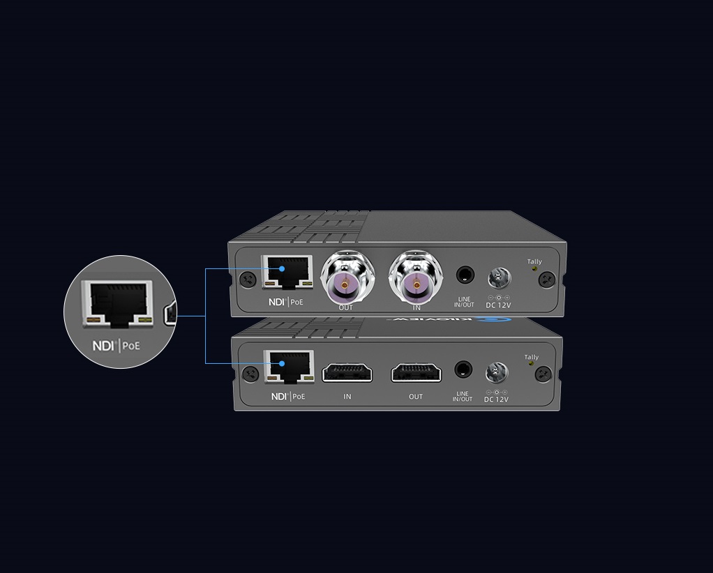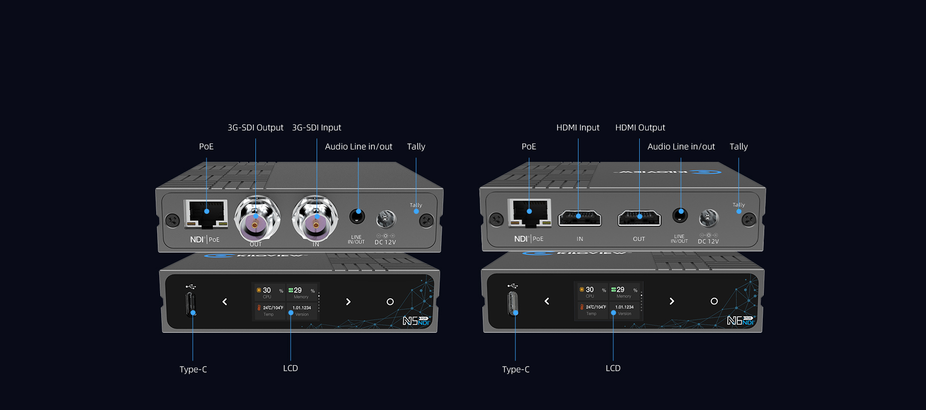 Featured with powerful functions such as PoE, LCD display with big-sized tally, PTZ control, 3.5mm audio line in/out, multi-channel audio encoding, intercom and centralized management, N5/N6 is the easiest and most cost-effective way to get access to the fabulous NDI world for low latency and high image quality.