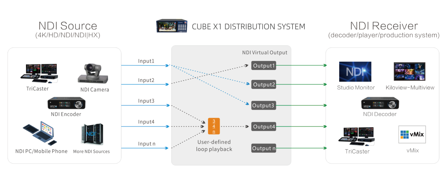 2. Multiple virtual outputs can be created within the CUBE X1 that can be connected to any NDI destination; it is also capable of seamless input/output switching.