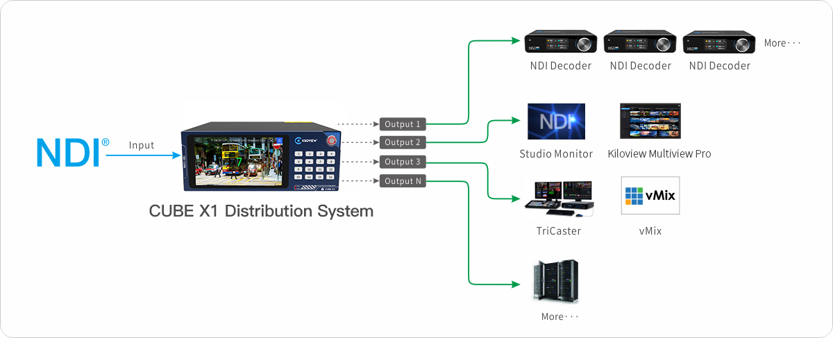 Unlike a simple routing switching mechanism, Kiloview CUBE X1 supports access to all NDI data sources, achieving seamless NDI signal switching and unlimited distribution. When you need to use the same NDI video source in multiple targets, the system can create multiple NDI outputs as needed, or the same output can support multiple targets connected at the same time.